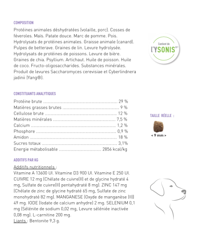 Protéines animales déshydratées (volaille, porc), cosses de féveroles, maïs, patate douce, marc de pomme, pois, hydrolysats de protéines animales, graisse animale (canard), pulpes de betterave, graines de lin, levure hydrolysée, hydrolysats de protéines de poissons, levure de bière, graines de chia, psyllium, artichaut, huile de poisson, huile de coco, fructo-oligosaccharides, substances minérales, produit de levures Saccharomyces cerevisiae et Cyberlindnera jadinii (Yang®).