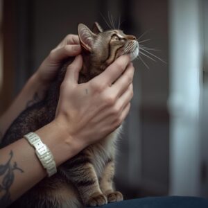 - Poser le chat sur vos genoux ou sur une surface surélevée, à hauteur pour faciliter le soin.