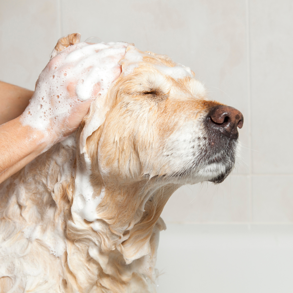 - Faire des bains et shampoings apaisants à base de chlorhexidine pour nettoyer et réduire l’inflammation de la peau. La fréquence des bains est à demander au vétérinaire, selon le type de dermatite et les besoins du chien.