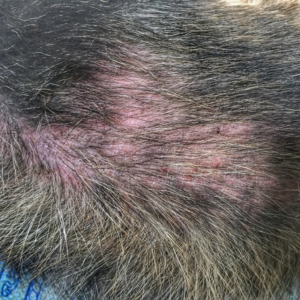 Les lésions primaires peuvent se manifester par des rougeurs, des papules, des plaques et parfois même l’apparition de pustules ou vésicules. Le léchage et grattage vont créer des lésions secondaires (Alopécie, croûtes et dans les cas chroniques : hyperpigmentation, épaississement de la peau).