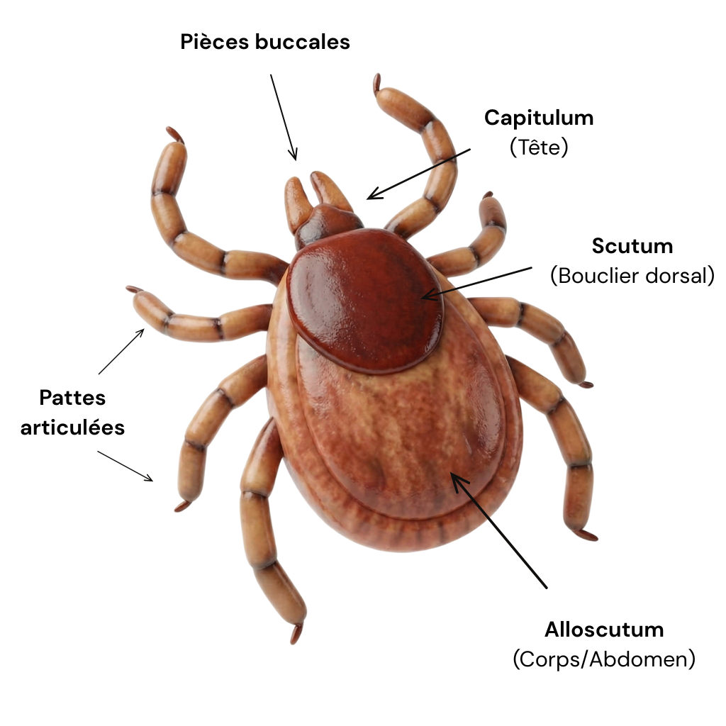 La tique est une espèce appartenant à la famille des acariens, possédant une paire de 4 pattes et dont la taille peut aller jusqu’à 1 cm lorsqu’elle est gorgée de sang après une piqûre. Contrairement à la puce, la tique ne saute pas et ne vole pas, elle vit dans l’environnement et plus particulièrement dans les herbes hautes, les champs, les jardins, les haies… De plus, elle ne se déplace jamais sur l’animal, lorsqu’elle est accrochée, elle ne bouge plus.